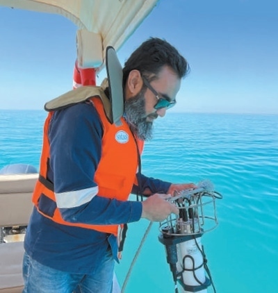 在中國(guó)港灣工程有限公司承建的沙特阿拉伯紅海開(kāi)發(fā)項(xiàng)目中,工作人員使用水質(zhì)檢測(cè)浮標(biāo)傳感器對(duì)施工區(qū)域內(nèi)水質(zhì)進(jìn)行監(jiān)測(cè)。唐浩偉攝