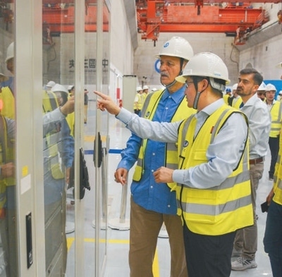 巴基斯坦卡洛特水電站是中巴經(jīng)濟(jì)走廊首個水電投資項目,由中國三峽集團(tuán)投資開發(fā)建設(shè),運營一年來節(jié)約標(biāo)準(zhǔn)煤約140萬噸,減少二氧化碳排放約350萬噸。圖為中方技術(shù)人員向來訪的巴基斯坦代表團(tuán)介紹水電站運行情況。本報巴基斯坦分社 薩義德·邁赫迪攝