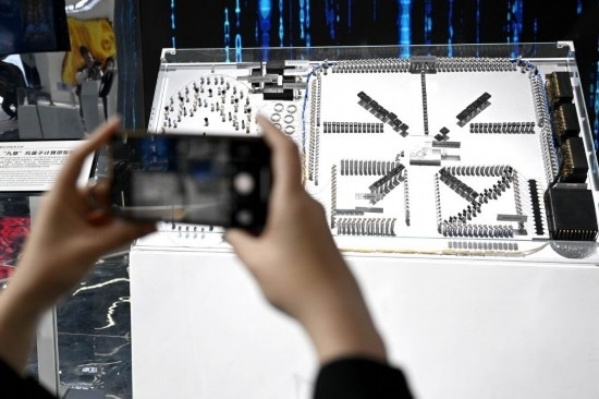 4月26日,觀眾在第二屆中國(安徽)科技創(chuàng)新成果轉化交易會上拍攝“九章”光量子計算原型機模型。新華社記者黃博涵 攝