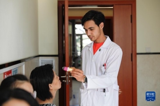 甘肅中醫(yī)藥大學針灸推拿專業(yè)的土庫曼斯坦留學生迪達(左)在臨床實習中為患者檢查眼睛(7月28日攝)。新華社記者 方欣 攝