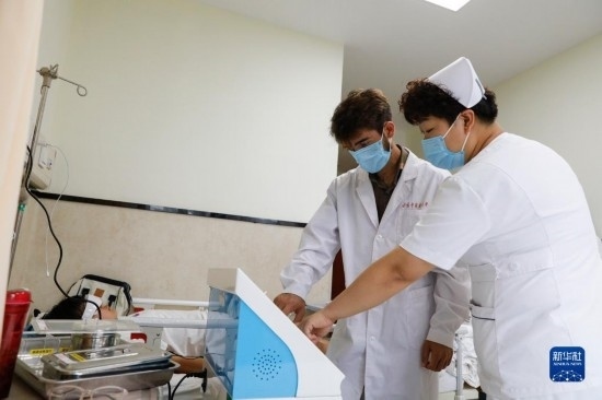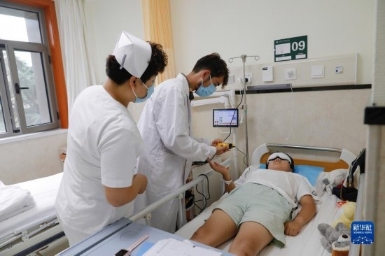 甘肅中醫(yī)藥大學針灸推拿專業(yè)的塔吉克斯坦留學生紀明哲(中)在臨床實習中為患者進行直流電離子導入操作(7月27日攝)。新華社記者 方欣 攝