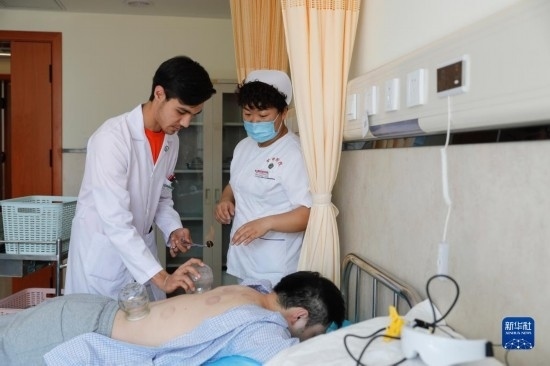 甘肅中醫(yī)藥大學針灸推拿專業(yè)的土庫曼斯坦留學生迪達(左)在甘肅中醫(yī)藥大學附屬醫(yī)院護士的指導下為患者進行拔罐治療(7月28日攝)。新華社記者 方欣 攝