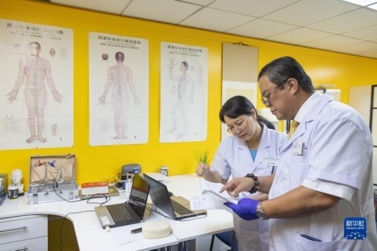 7月20日,在匈牙利布達佩斯匈牙利岐黃中醫(yī)藥中心,中心負責人陳震(右)和甘肅外派專家張海芳一同討論。新華社發(fā)(弗爾季·奧蒂洛攝)