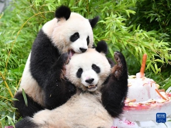 8月31日,大熊貓“夢(mèng)想”(左)和“夢(mèng)圓”在德國(guó)柏林動(dòng)物園享用“生日餐”。當(dāng)日,在德國(guó)出生的大熊貓雙胞胎兄弟“夢(mèng)想”和“夢(mèng)圓”迎來(lái)4歲生日,柏林動(dòng)物園為它們舉辦了慶?;顒?dòng)。新華社記者 任鵬飛 攝
