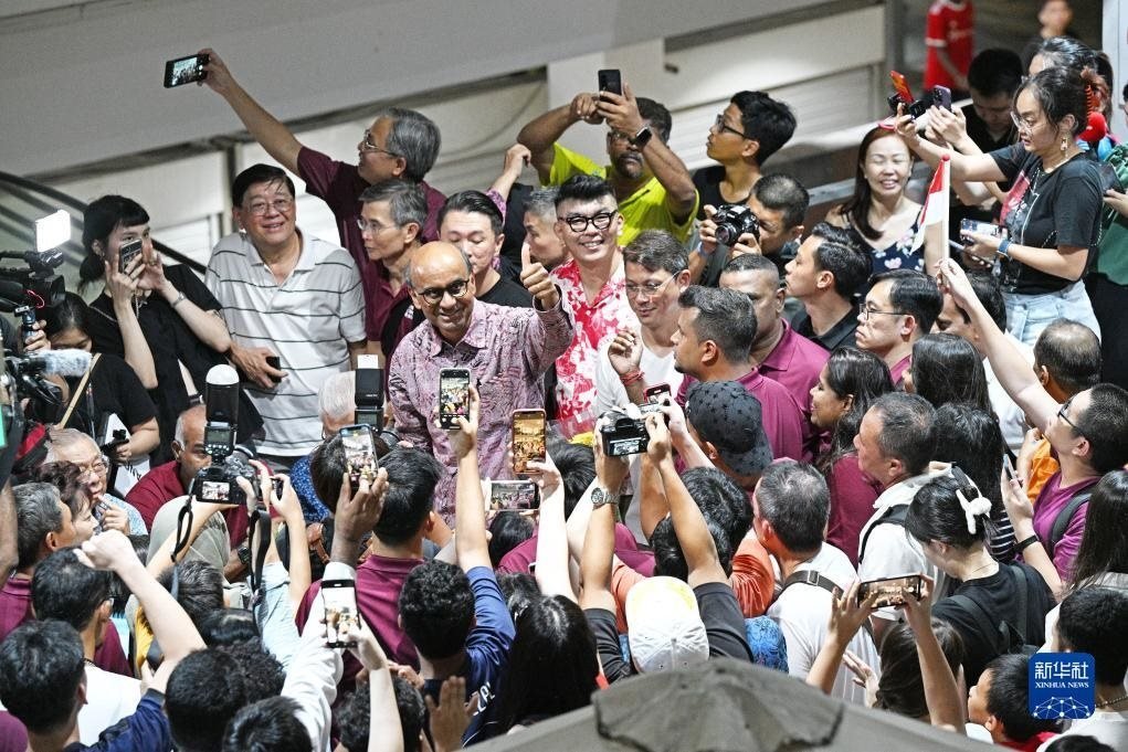 9月1日,新加坡總統(tǒng)候選人尚達(dá)曼(中)在裕廊等待總統(tǒng)選舉結(jié)果揭曉時(shí)向支持者致意。新華社發(fā)(鄧智煒攝)