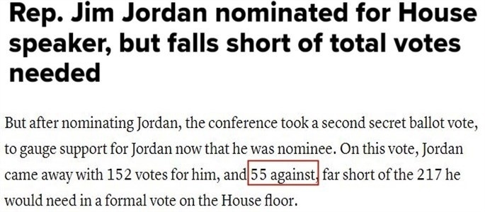 據(jù)報道,喬丹13日贏得提名后,共和黨人立刻舉行了第二輪閉門投票,以檢驗喬丹所獲黨內(nèi)支持情況。結(jié)果顯示,152名共和黨人將在全院表決中投贊成票,55名共和黨人將投反對票。