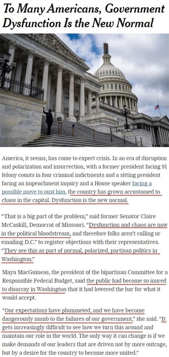 文章援引密蘇里州前民主黨籍參議員麥卡斯基爾的話說,作為華盛頓兩極分化的黨派政治的一部分,“功能失調(diào)和混亂已經(jīng)融入政治血液”。