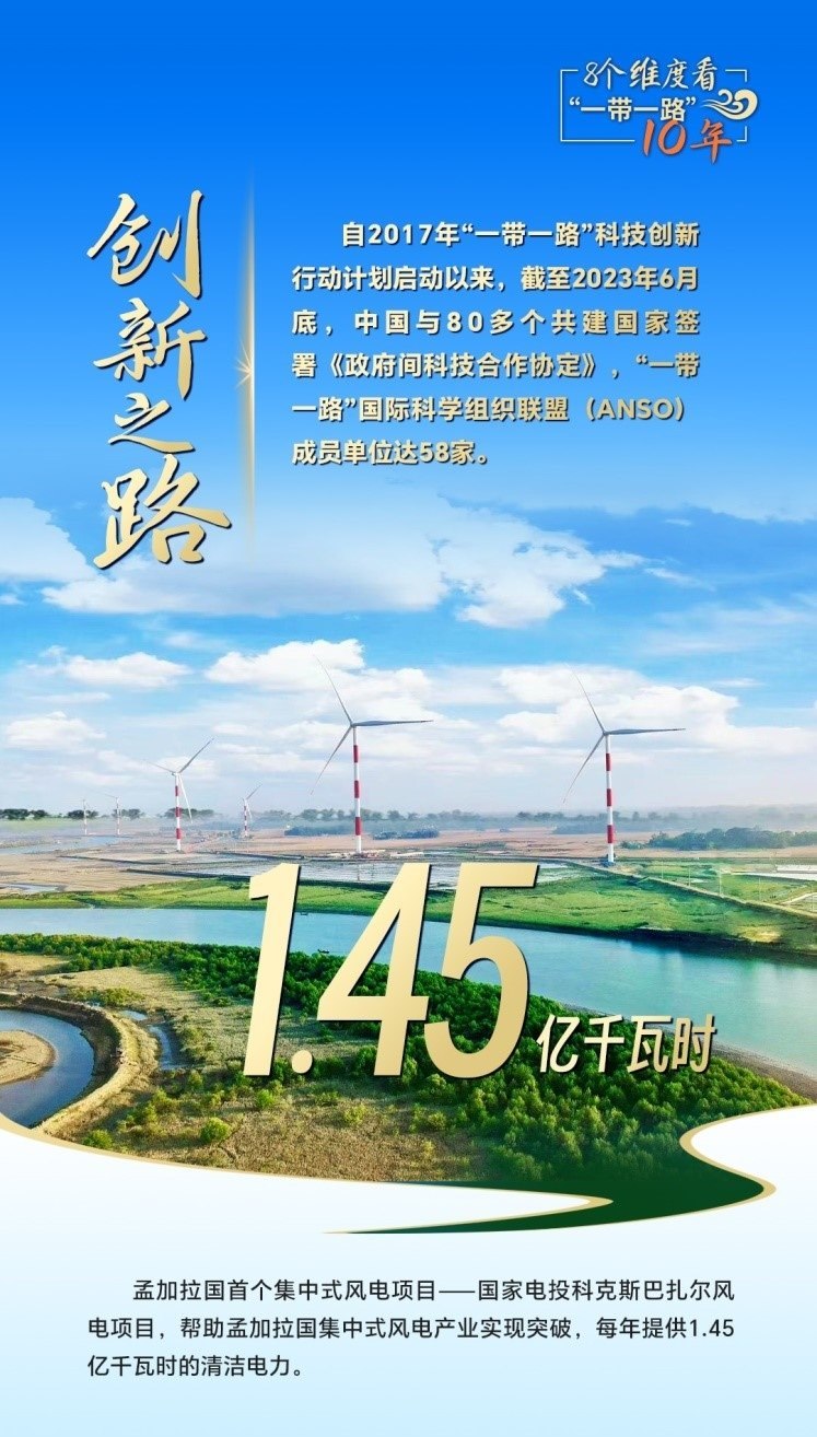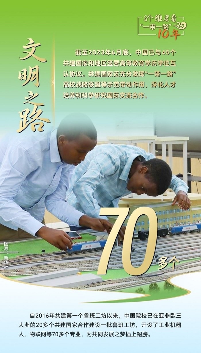 10年來,創(chuàng)新始終是一個關(guān)鍵詞,中國與共建國家加強(qiáng)科技創(chuàng)新合作,加速集聚創(chuàng)新資源,為共建“一帶一路”注入強(qiáng)勁動力。截至2023年6月底,中國與80多個共建國家簽署《政府間科技合作協(xié)定》,“一帶一路”國際科學(xué)組織聯(lián)盟(ANSO)成員單位達(dá)58家;2013年以來,中國支持逾萬名共建國家青年科學(xué)家來華開展短期科研工作和交流,累計培訓(xùn)共建國家技術(shù)和管理人員1.6萬余人次;累計幫助50多個非洲國家建成20多個農(nóng)業(yè)技術(shù)示范中心,在農(nóng)業(yè)、新能源、衛(wèi)生健康等領(lǐng)域啟動建設(shè)50余家“一帶一路”聯(lián)合實驗室。