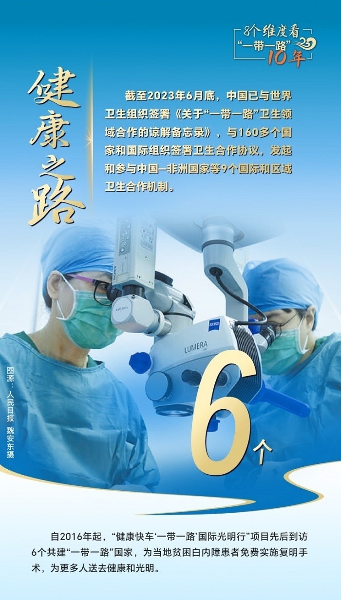 截至2023年6月底,中國已與世界衛(wèi)生組織簽署《關(guān)于“一帶一路”衛(wèi)生領(lǐng)域合作的諒解備忘錄》,與160多個國家和國際組織簽署衛(wèi)生合作協(xié)議,發(fā)起和參與中國—非洲國家、中國—阿拉伯國家、中國—東盟衛(wèi)生合作等9個國際和區(qū)域衛(wèi)生合作機(jī)制。為共建國家培養(yǎng)數(shù)萬名衛(wèi)生管理、公共衛(wèi)生、醫(yī)學(xué)科研等專業(yè)人才,向58個國家派出中國醫(yī)療隊,赴30多個國家開展“光明行”,免費治療白內(nèi)障患者近萬名,與湄公河流域國家、中亞國家、蒙古國等周邊國家開展跨境醫(yī)療合作,衛(wèi)生健康合作成效顯著。