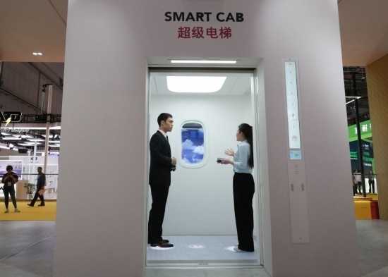11月5日,工作人員(右)在第六屆進(jìn)博會(huì)上向參觀者介紹奧的斯公司全新推出的超級(jí)電梯。