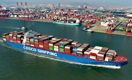 2021年2月19日,在位于山東自貿(mào)試驗(yàn)區(qū)青島片區(qū)的山東港口青島港前灣集裝箱碼頭,一艘滿載集裝箱的貨輪駛出港口。