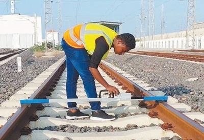 奧斯曼在亞吉鐵路的一座車站進行巡檢。中國土木工程集團吉布提有限公司供圖
