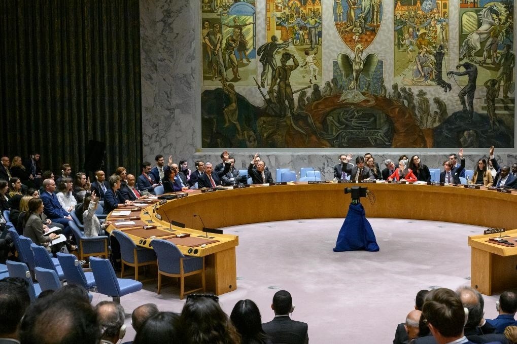 這是12月8日在位于紐約的聯(lián)合國總部拍攝的聯(lián)合國安理會會議現(xiàn)場。美國當(dāng)天否決了聯(lián)合國安理會一份旨在推動實現(xiàn)巴以人道主義?;鸬臎Q議草案。新華社發(fā)(聯(lián)合國供圖/洛伊·費利佩攝)