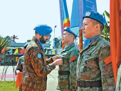 7月25日,剛果(金)南基伍省布卡武市中國半島營區(qū)。在高高飄揚(yáng)的聯(lián)合國旗幟和中國、剛果(金)兩國國旗下,中國第二十六批赴剛果(金)維和部隊(duì)全體官兵被授予聯(lián)合國“和平勛章”。