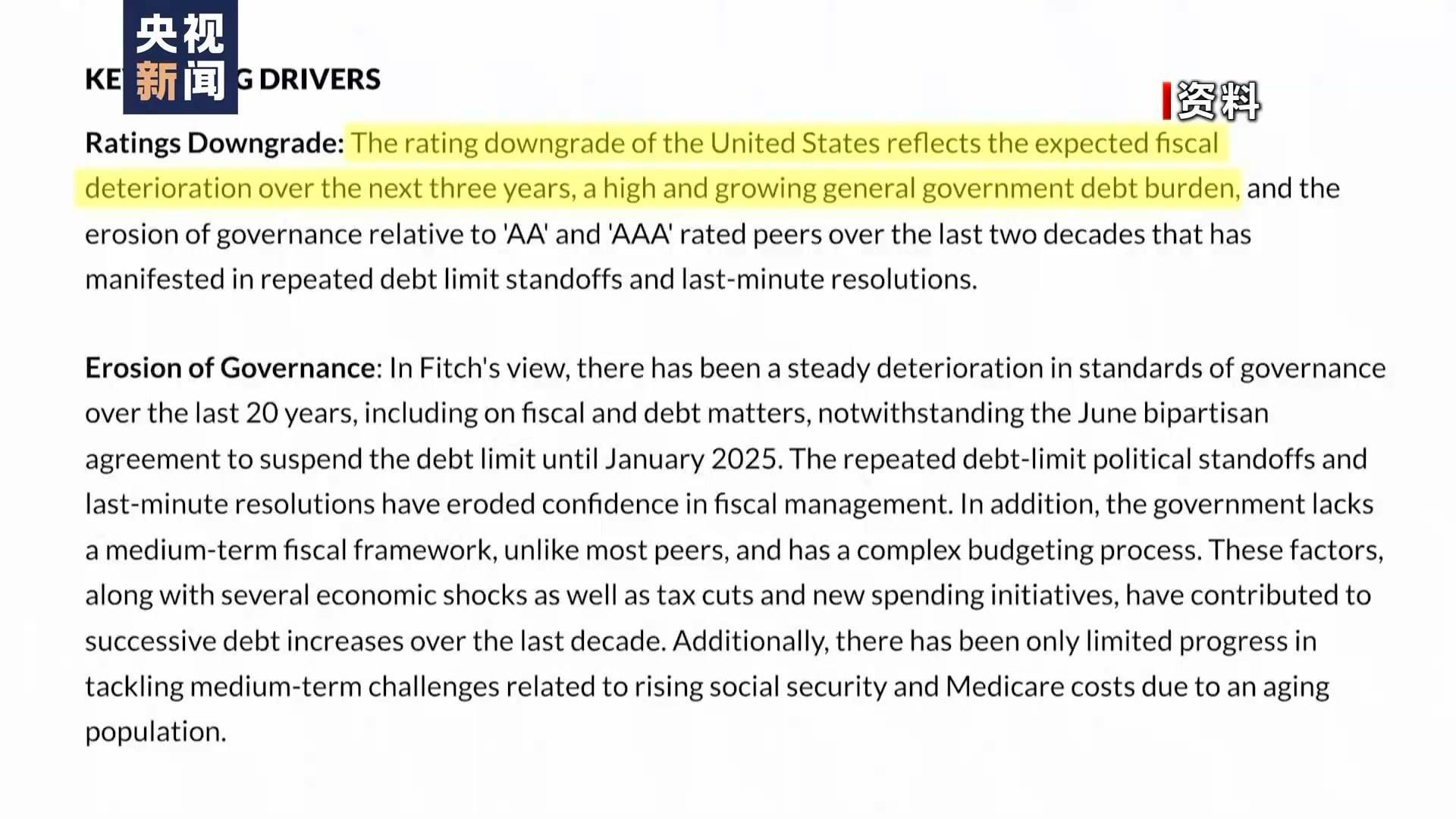 到了2023年8月1日,國際評級機構(gòu)惠譽將美國長期外幣發(fā)行人違約評級從AAA下調(diào)至AA+?;葑u當(dāng)天發(fā)表聲明說,下調(diào)美國信用評級主要由于美國政府債務(wù)負擔(dān)居高不下且不斷加重,未來3年財政狀況預(yù)計將持續(xù)惡化。