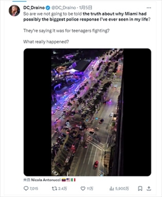 報道還提到,X平臺上另一篇帖子內(nèi)容稱,邁阿密警方此次出警執(zhí)法可能是“我一生中見過規(guī)模最大”的警方行動,然而官方?jīng)]有告知公眾真相,“他們說那是青少年打斗,到底發(fā)生了什么?”這則帖子內(nèi)容目前已獲5900萬閱讀量。↓