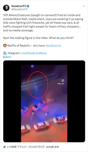 報道提到,一個推廣涵蓋科幻、陰謀論等內(nèi)容電影和紀(jì)錄片的X平臺賬號曬出現(xiàn)場視頻稱,“10英尺高的外星人/生物(被攝像機拍到?)朝邁阿密購物中心內(nèi)外開火,媒體沉默,警察掩蓋說孩子們?nèi)挤艧熁ú⒋蚨?,然而除了黑色軍用直升機,所有警車和空中交通都在那天晚上一動不動……這卻沒有媒體報道。視頻中出現(xiàn)了行走的身影。你覺得呢?”↓