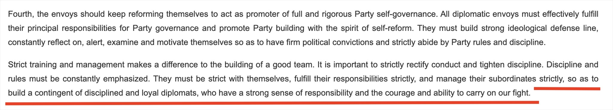 “鐵軍”一詞常見于政府文件或領(lǐng)導(dǎo)人講話,更多的是強(qiáng)調(diào)工作作風(fēng)和紀(jì)律。在近年來(lái)中國(guó)領(lǐng)導(dǎo)人講話中,曾多次出現(xiàn)“紀(jì)律監(jiān)察鐵軍”“生態(tài)環(huán)境保護(hù)鐵軍”等表述。中國(guó)領(lǐng)導(dǎo)人在接見與會(huì)使節(jié)時(shí)的講話中說(shuō):“打造一支對(duì)黨忠誠(chéng)、勇于擔(dān)當(dāng)、敢斗善斗、紀(jì)律嚴(yán)明的外交鐵軍。”外交部網(wǎng)站對(duì)這句話的英文翻譯(見下圖)同樣強(qiáng)調(diào)外交隊(duì)伍的紀(jì)律、責(zé)任和勇氣。作為通行做法,世界各國(guó)對(duì)本國(guó)外交人員都有著很高的紀(jì)律要求。
