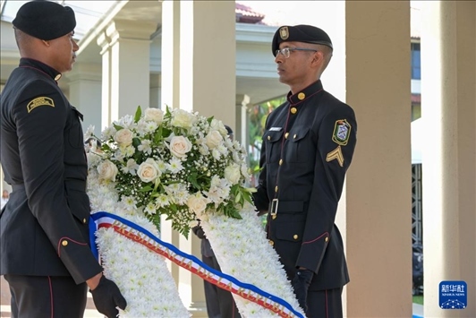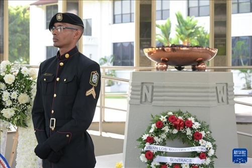 1月9日,在巴拿馬首都巴拿馬城,兩名士兵向紀(jì)念“護(hù)旗運動”的“永恒之火”紀(jì)念碑獻(xiàn)花圈。新華社記者 陳昊佺 攝