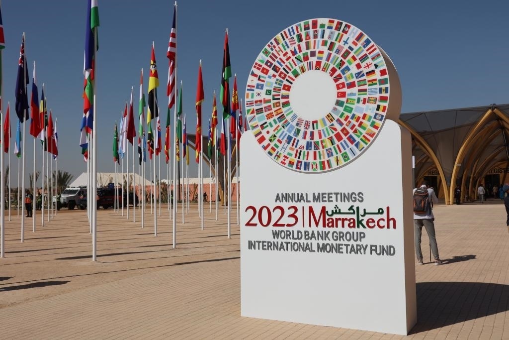 這是2023年10月9日在摩洛哥馬拉喀什拍攝的國(guó)際貨幣基金組織(IMF)和世界銀行年會(huì)標(biāo)志。新華社記者霍晶攝