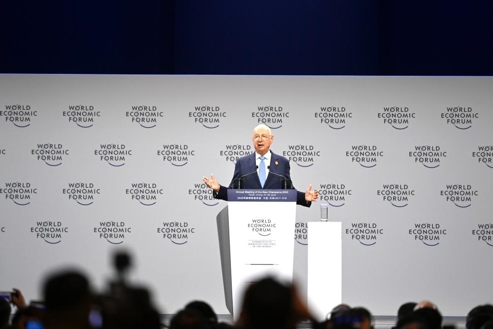2023年6月27日,世界經(jīng)濟(jì)論壇主席施瓦布在第十四屆夏季達(dá)沃斯論壇開(kāi)幕式上發(fā)言。新華社記者趙子碩攝
