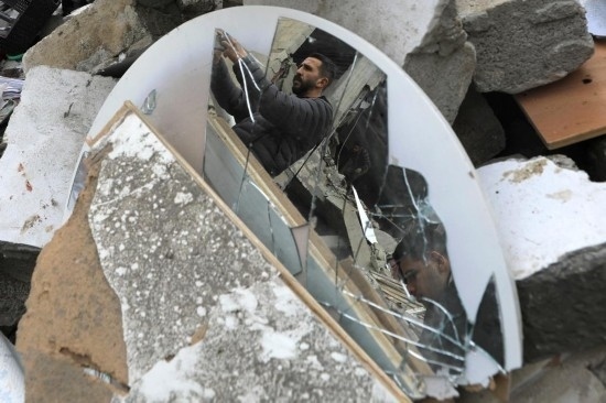 1月17日,在加沙地帶南部城市拉法,查看以軍空襲后受損建筑的人們的身影倒映在破裂的鏡面上。新華社發(fā)(亞西爾·庫(kù)迪攝)
