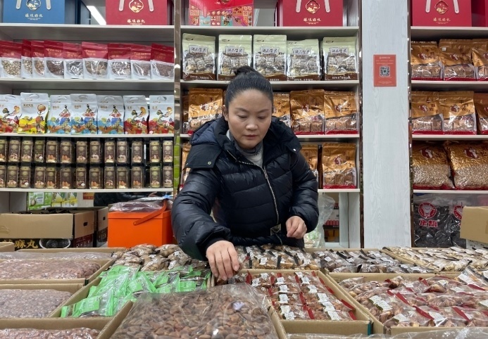 這是湖南長沙高橋大市場堅果經(jīng)銷商李海麗在整理貨物。新華社記者 余春生 攝