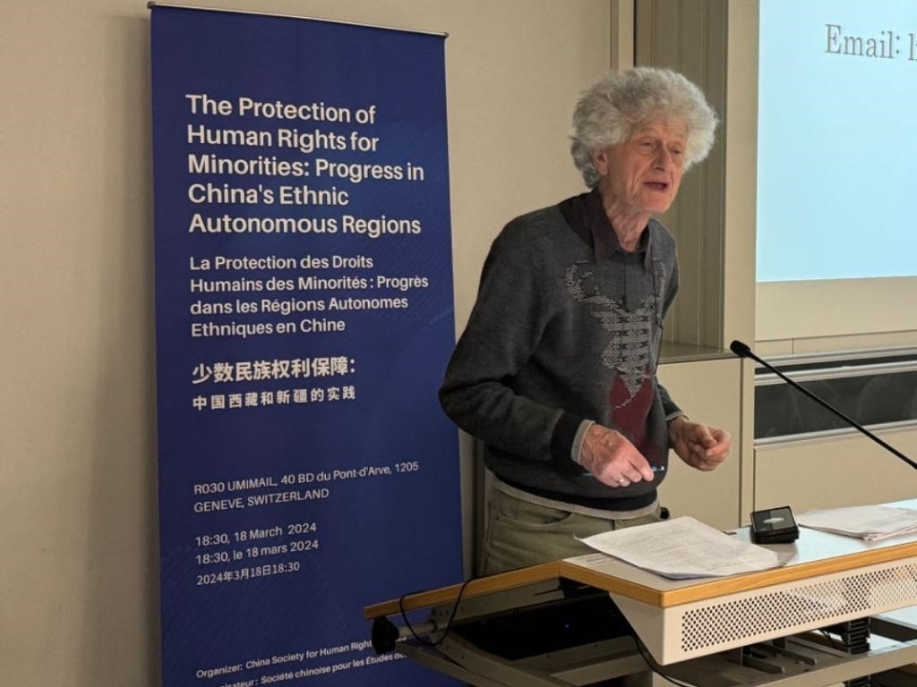 ?3月18日,由中國人權(quán)研究會主辦的“少數(shù)民族權(quán)利保障:中國西藏和新疆實(shí)踐”主題講座在瑞士日內(nèi)瓦舉行。圖為比利時(shí)知名藏學(xué)家安德烈·拉克魯瓦在講座上發(fā)言。新華社記者石松攝