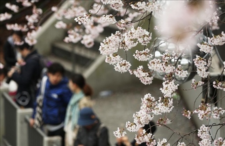 2016年4月1日,在日本首都東京,游客在千鳥淵賞櫻。新華社記者劉天攝