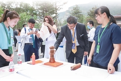 2023年7月3日,第三屆文明交流互鑒對話會暨首屆世界漢學家大會與會嘉賓體驗非遺拓印技藝。劉馳攝