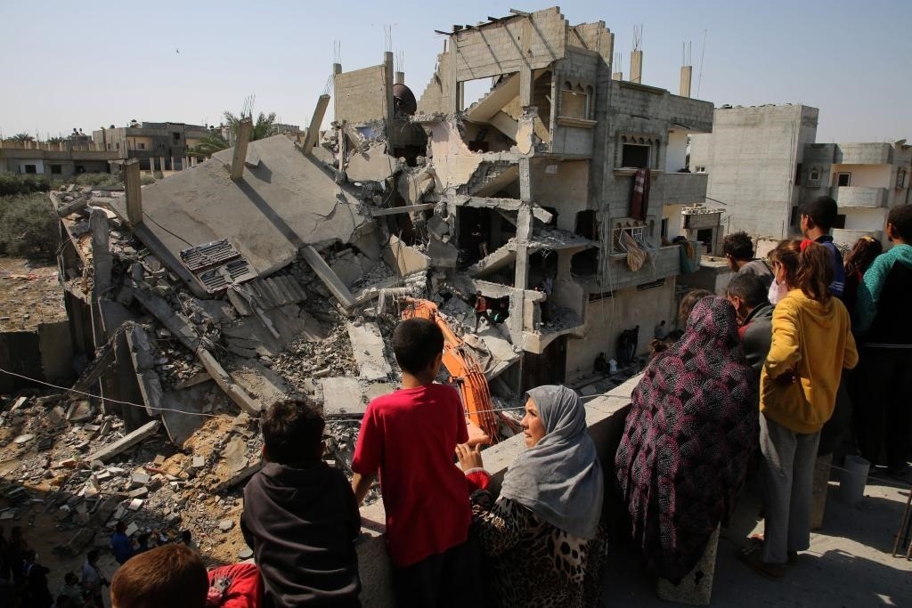 ?4月2日,在加沙地帶南部城市拉法,人們查看被以軍空襲后的建筑。新華社發(fā)(哈立德·奧馬爾攝)