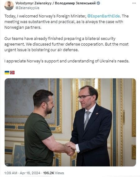 澤連斯基15日在其官方社交平臺(tái)上表示,“我們已經(jīng)完成了(烏克蘭和挪威的)雙邊安全協(xié)議準(zhǔn)備工作,并討論了進(jìn)一步的防務(wù)合作。最緊迫的問(wèn)題是加強(qiáng)我們的防空能力。”