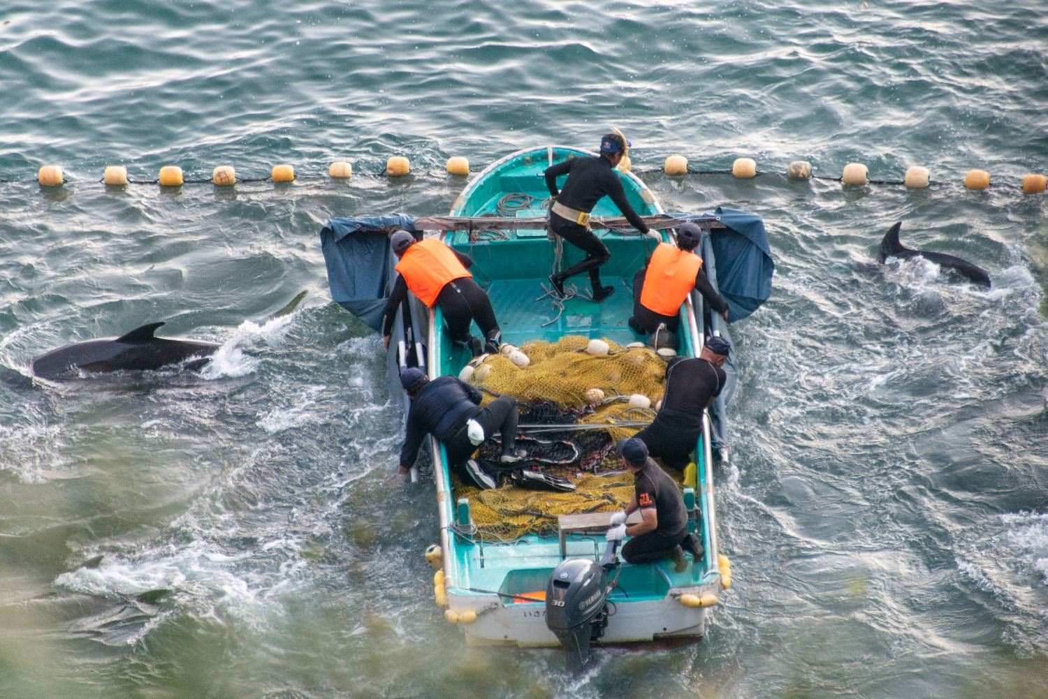 太地町又被稱為“海豚灣”,紀錄片《海豚灣》曾揭露該地屠殺海豚的血腥景象。每年9月到次年3月,捕鯨者們會聚集在太地町,捕殺海豚或其它小型鯨類。捕鯨者們將鋼桿放入海中,用錘子敲打,在水下形成聲墻,這些鋼柱兩端的金屬 "風扇"會放大敲擊聲,使海豚迷失方向。隨后,捕鯨船會逼近海豚,將它們引入 "海灣",拉網誘捕,開啟“挑選海豚”的流程。作為肉類出售的海豚會被血腥屠殺。