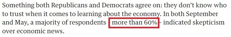 而無論是共和黨人還是民主黨人,幾乎所有受訪者都同意的一點是:在了解經(jīng)濟情況方面,他們不知道該相信誰。民調(diào)顯示,超六成美國人對經(jīng)濟新聞的真實性表示質(zhì)疑。