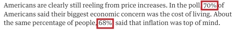 在《衛(wèi)報》發(fā)布的民意調(diào)查中,有70%的受訪者表示,他們最大的經(jīng)濟擔憂是生活成本;大約同樣比例的人(68%)說,通貨膨脹是他們最關(guān)心的問題。