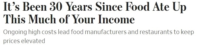 《華爾街日報》報道稱,持續(xù)的高成本導致食品制造商和餐館繼續(xù)抬高價格,“食物支出‘吃掉’這么多收入,已經(jīng)是30年前的事”。