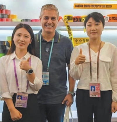 梅洛(中)在第135屆廣交會現(xiàn)場。受訪者供圖