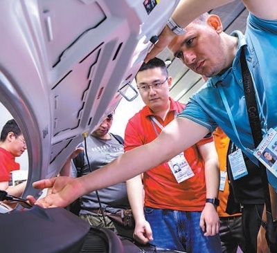一名外國采購商在第135屆廣交會新能源汽車展區(qū)詳細了解一款車型。新華社記者 劉大偉攝
