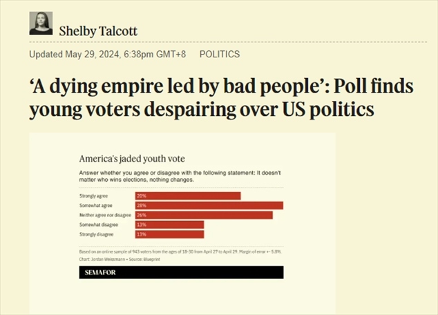 中國(guó)日?qǐng)?bào)網(wǎng)5月30日電 當(dāng)?shù)貢r(shí)間29日,美國(guó)媒體Semafor網(wǎng)站報(bào)道,民主黨戰(zhàn)略組織“Blueprint”公布的一項(xiàng)最新民意調(diào)查顯示,美國(guó)18歲至30歲的選民中至少有一半人對(duì)美國(guó)的政治制度持負(fù)面看法,其中超過(guò)60%的人認(rèn)為美國(guó)正在衰落。