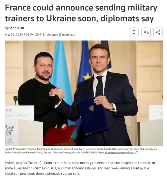 5月30日,路透社援引三位匿名外交消息人士稱,法國可能很快會(huì)向?yàn)蹩颂m派遣軍事教官。