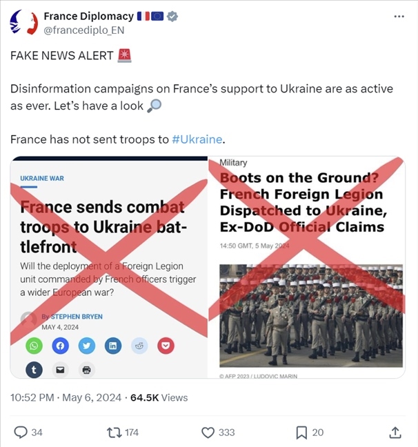 5月6日,法國外交部在X平臺(tái)上明確表示,“法國還沒有向?yàn)蹩颂m派兵?!?/p>
