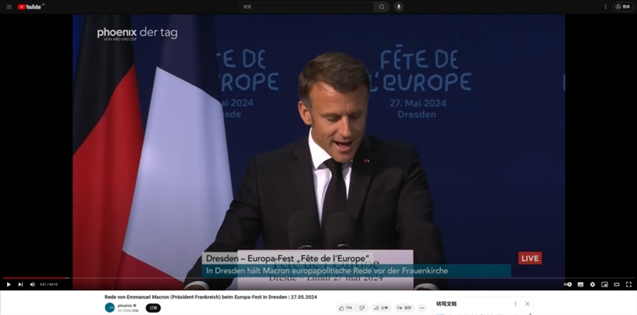 Phoenix在其YouTube頻道上播出的馬克龍演講的完整版本截圖。網(wǎng)傳視頻顯示的音頻內(nèi)容與Phoenix播出的馬克龍?jiān)诘吕鬯诡D進(jìn)行演講時(shí)開篇的音頻一致,且拍攝現(xiàn)場的環(huán)境高度吻合。