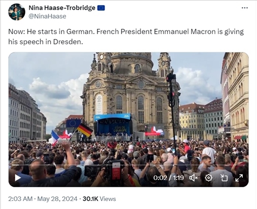 X平臺(tái)用戶@NinaHaase在28日凌晨2點(diǎn)03分發(fā)布的推文截圖,稱“現(xiàn)在,法國總統(tǒng)埃馬紐埃爾·馬克龍正在德累斯頓發(fā)表演講,他開場用了德語”,沒有提到法國軍隊(duì)。