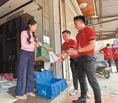 中午時分,記者來到老撾首都萬象市塔鑾附近的一處便民服務點。摩托車來來往往,不時有當?shù)鼐用駚泶耸瞻l(fā)電商商品。工作人員正忙著將收到的商品掃描、稱重、歸類、打包,趕在傍晚送到轉運中心發(fā)往目的地。