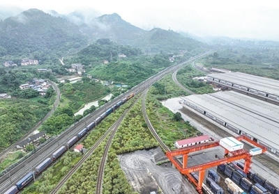 6月27日,西部陸海新通道中老泰馬跨境鐵路班列在重慶江津小南埡站發(fā)車(無人機照片)。該班列的開行將促進通道沿線地區(qū)與東盟國家的經貿合作和產業(yè)聯(lián)動。新華社記者 唐 奕攝