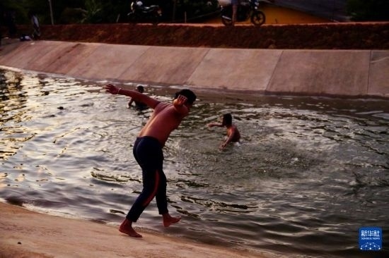 8月9日,當(dāng)?shù)孛癖娫?7公里水渠中嬉戲。新華社記者 伍岳 攝