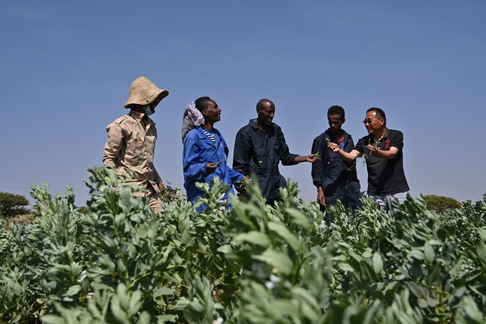 2023年9月27日,在位于厄立特里亞阿斯馬拉的農(nóng)業(yè)技術(shù)援助項目示范地,中國援厄第三期高級農(nóng)業(yè)專家組豆類作物專家劉運(yùn)民(右一)與當(dāng)?shù)剞r(nóng)戶交流。為推動厄立特里亞農(nóng)業(yè)產(chǎn)業(yè)發(fā)展,中國農(nóng)業(yè)農(nóng)村部已派出多批專家在厄立特里亞開展涉及豆類作物、果樹園藝、油料等領(lǐng)域的技術(shù)援助工作。