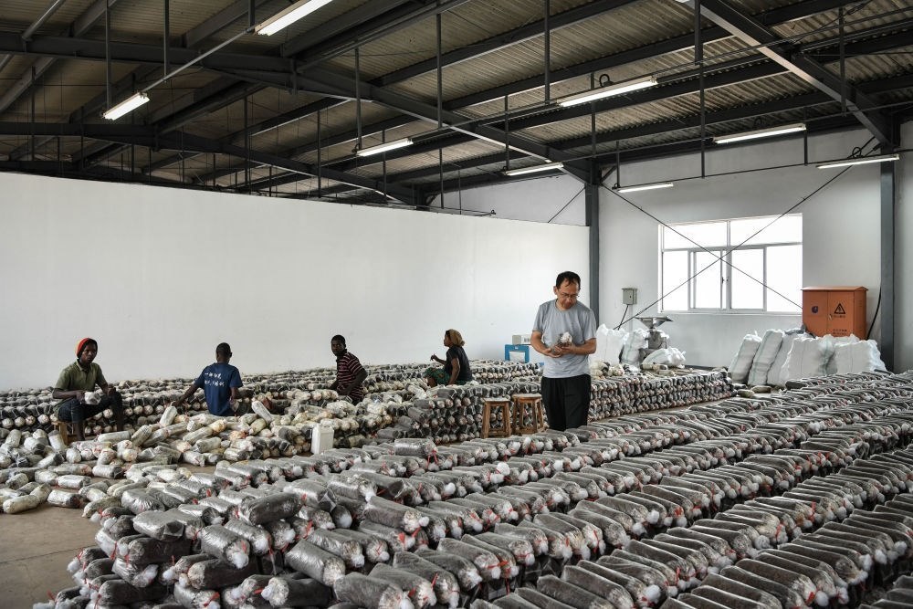 2024年8月13日,在盧旺達(dá)南方省胡耶區(qū)的中國援盧農(nóng)業(yè)技術(shù)示范中心,菌草專家陳曉斌(右)檢查菌袋。自菌草技術(shù)引入盧旺達(dá)以來,當(dāng)?shù)鼐莓a(chǎn)業(yè)發(fā)展迅速,不僅為市場提供了豐富的食用菌產(chǎn)品,還創(chuàng)造了大量就業(yè)機(jī)會。