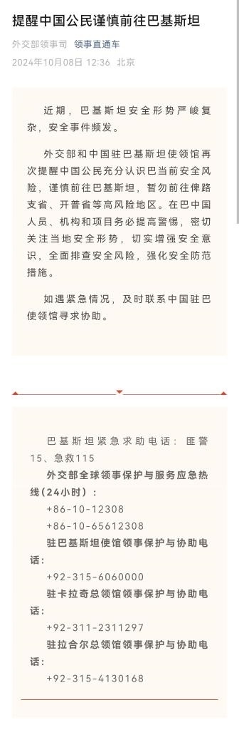 據(jù)外交部“領(lǐng)事直通車”微信公眾號10月8日消息,近期,巴基斯坦安全形勢嚴峻復雜,安全事件頻發(fā)。