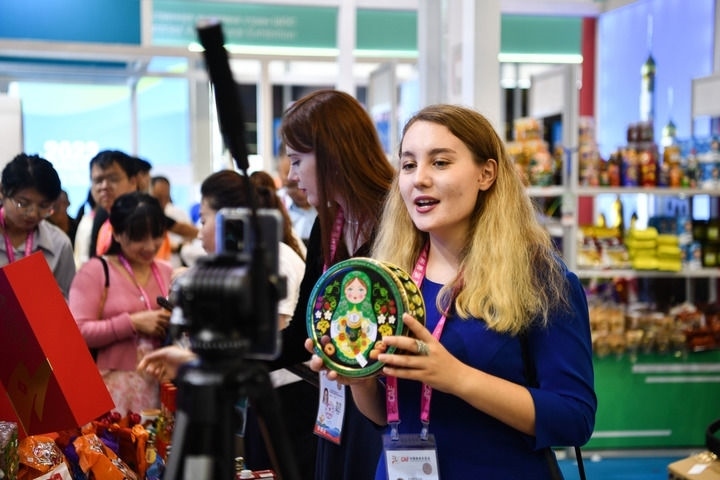 2023年9月19日,來自俄羅斯的參展商在中國陜西楊凌農(nóng)高會展臺進(jìn)行直播。新華社記者 張博文 攝